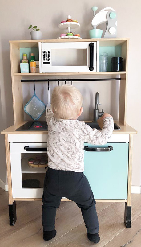 Fint fixat Duktig-kök med färg på köksluckan som matchar leksakerna.