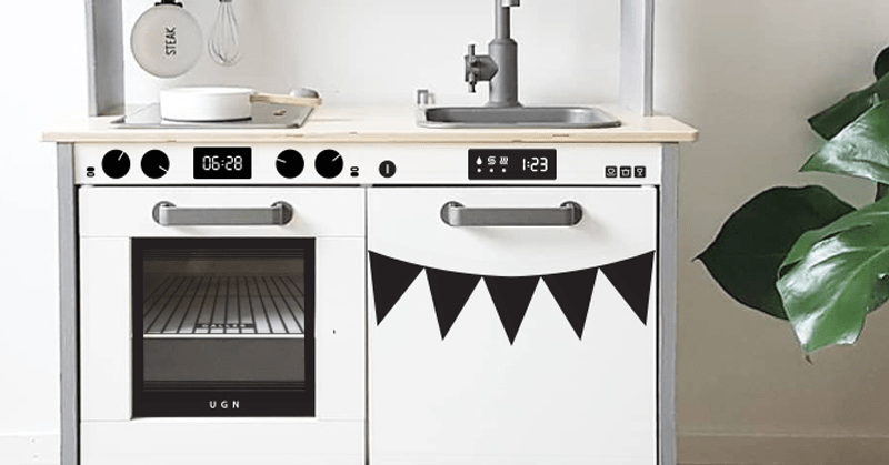 Ugnsvred, dekor till ugnslucka, reglage till diskmaskin och vimplar – detaljer från Kulform som skymtar på bilden av detta fina lilla Duktig-kök!