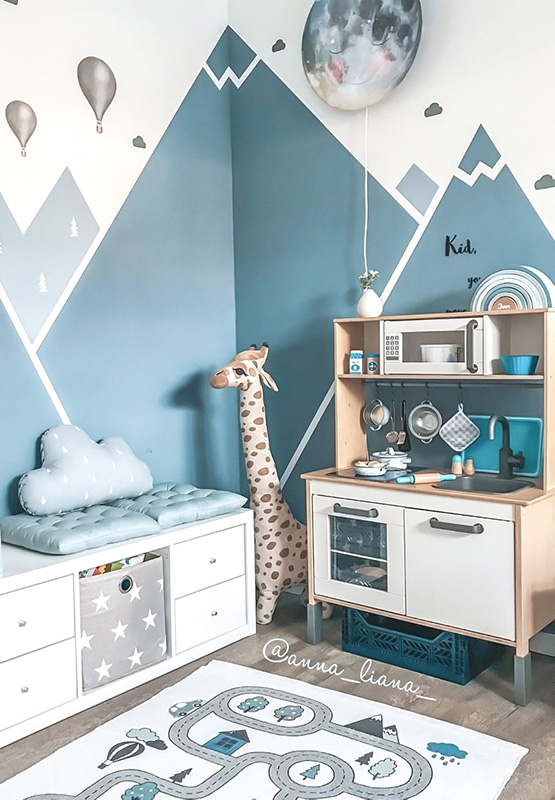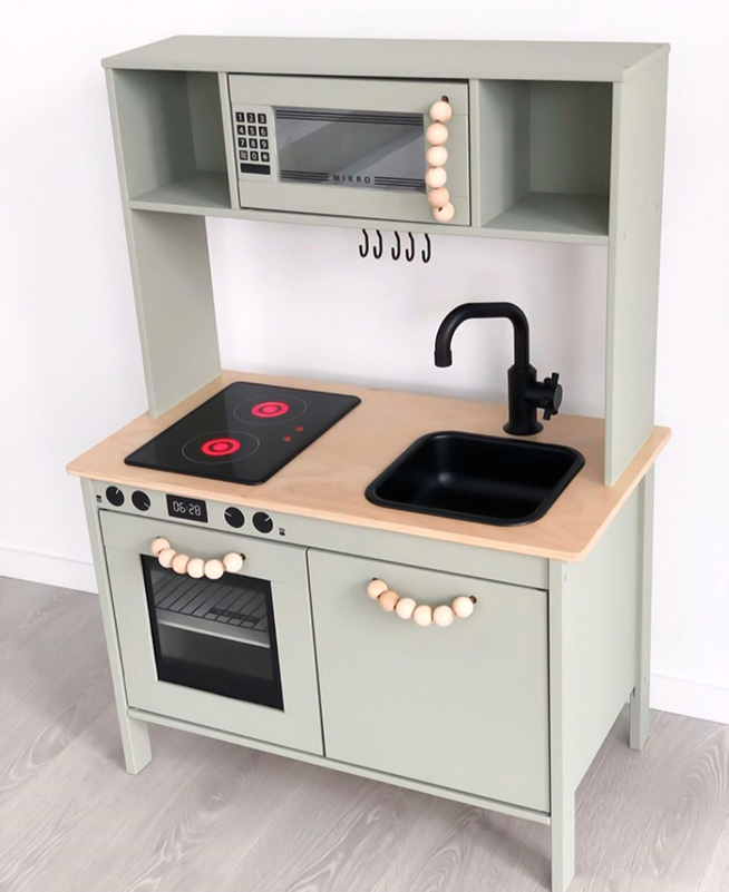 Fint fixat kök i ljusa toner som matchar övriga detaljer i barnrummet.