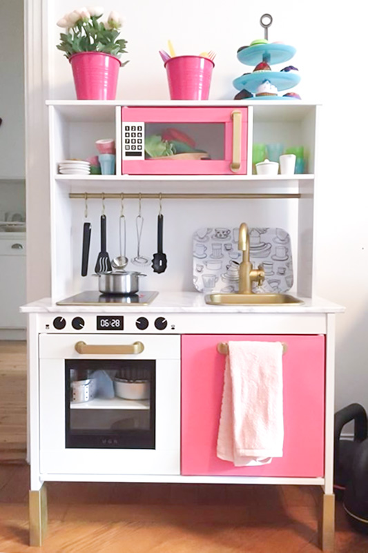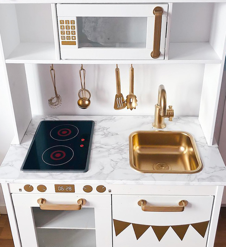 Inte nog med att detaljerna på lekköket fått guldfärg – det finns även matchande köksredskap av guld!