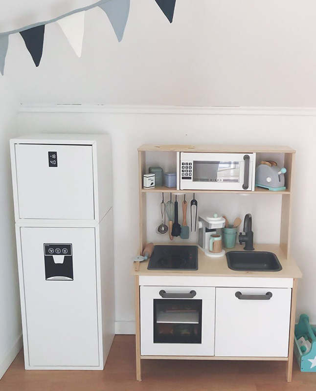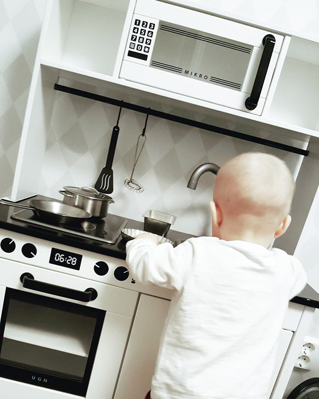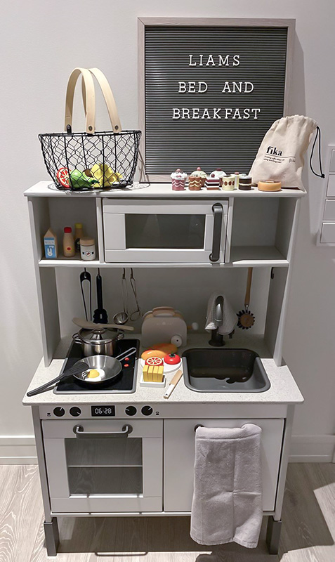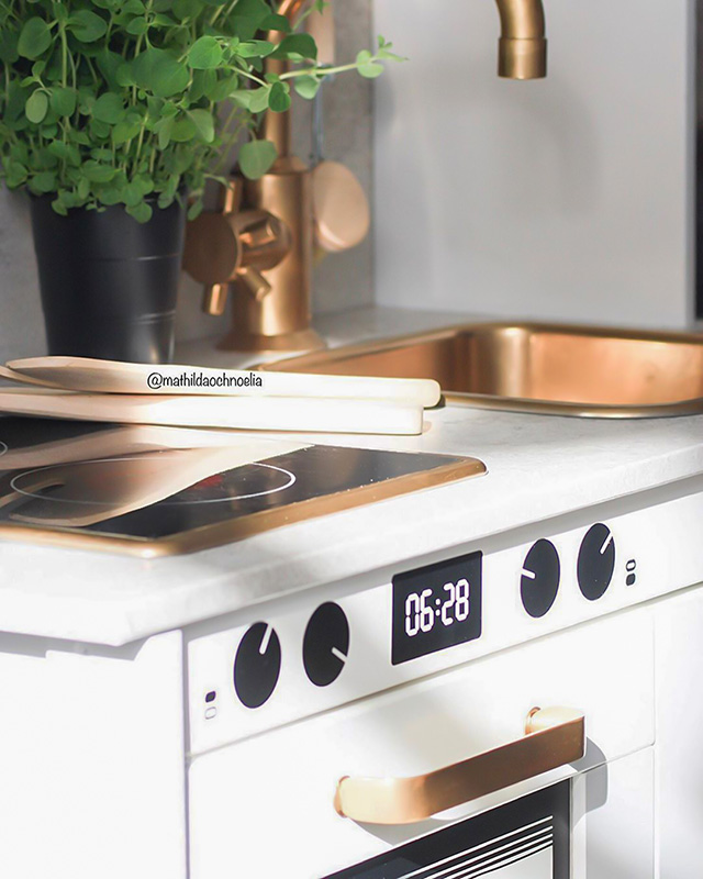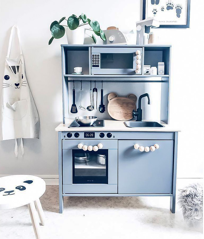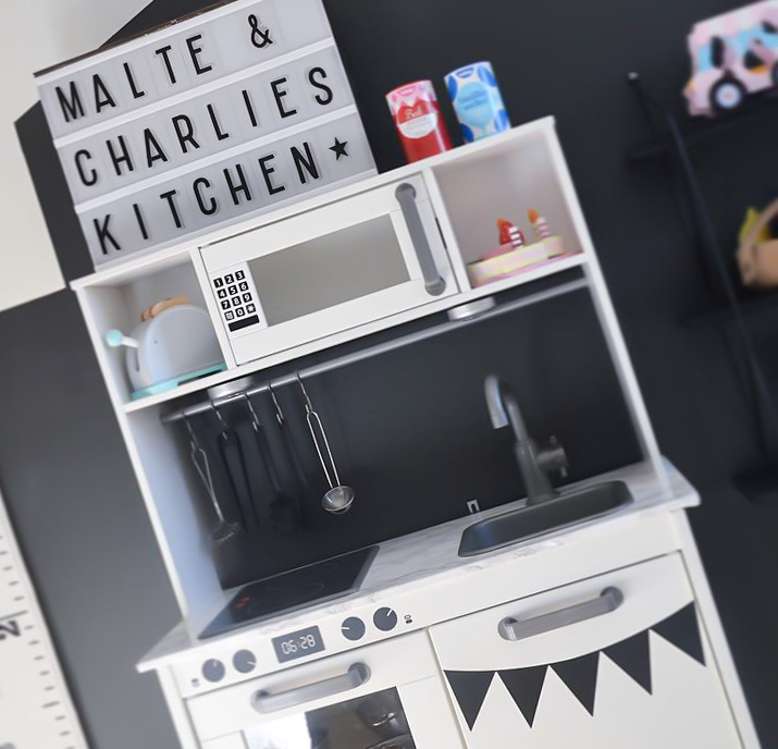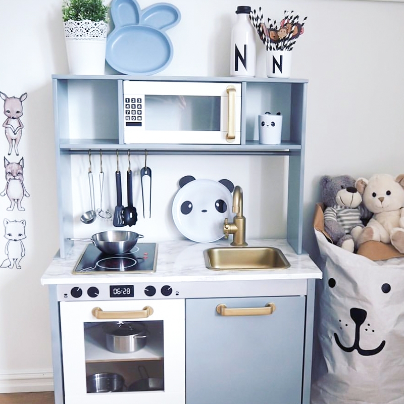 Duktig-köket är fint även utan hyllan fram. Här en jättefin version av köket med grå bänkskiva och ett rosa skåp. Läckert med de svarta detaljerna till och enhetlig kran, vask och handtag.