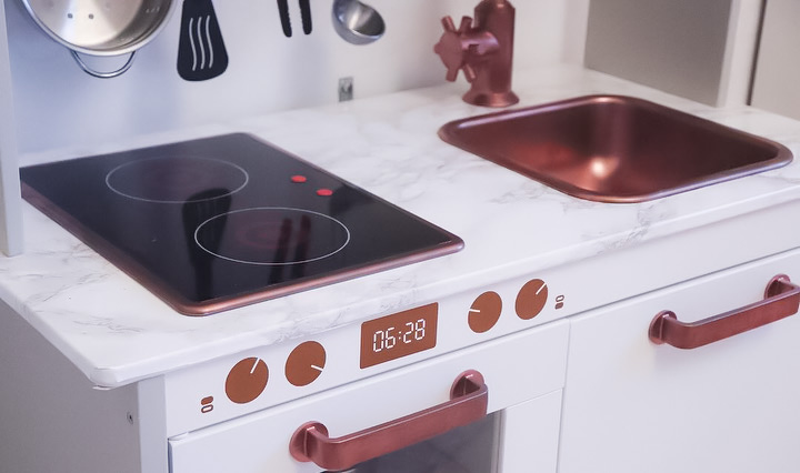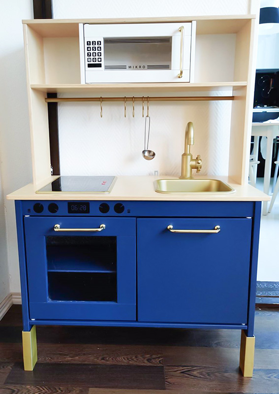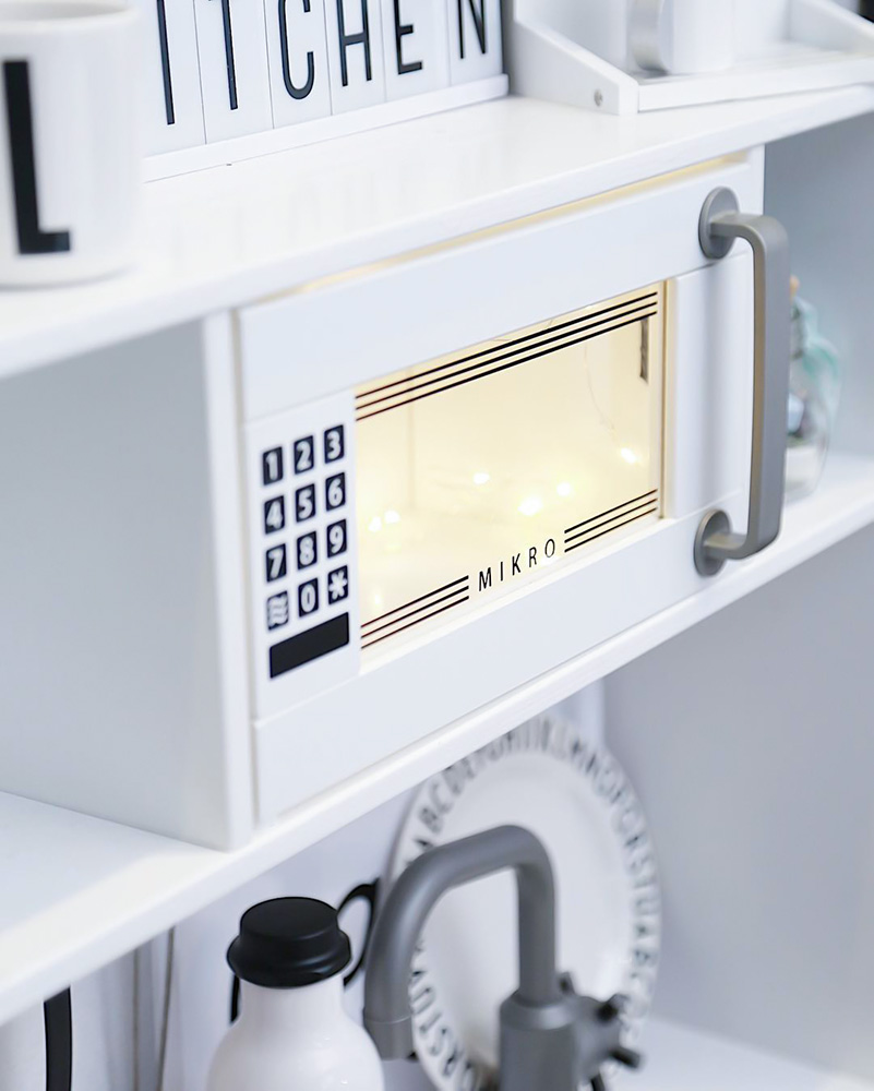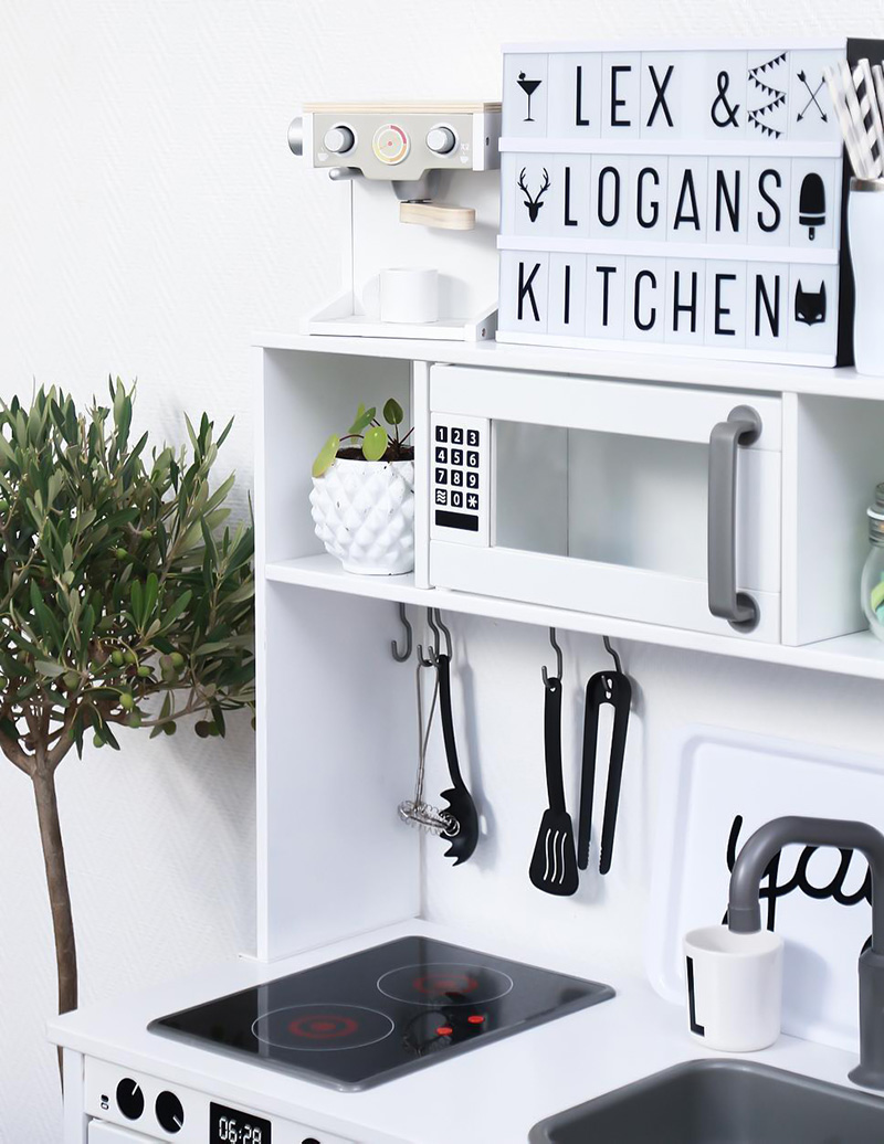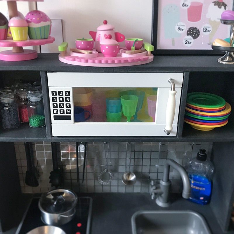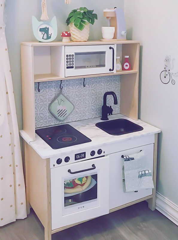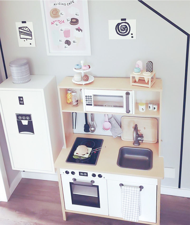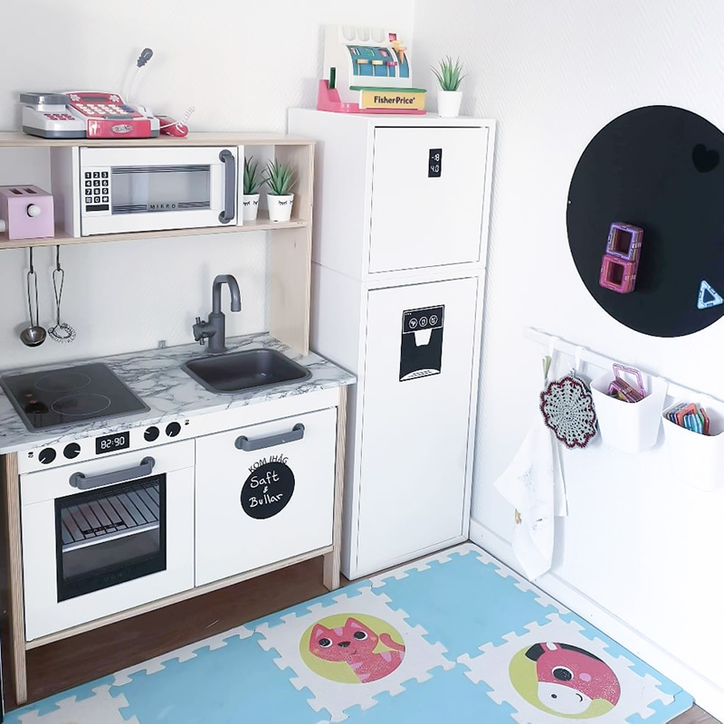 Köket har fått sällskap av ett litet kylskåp i lekhörnan. Duktig och Eket från IKEA matchar varandra perfekt.