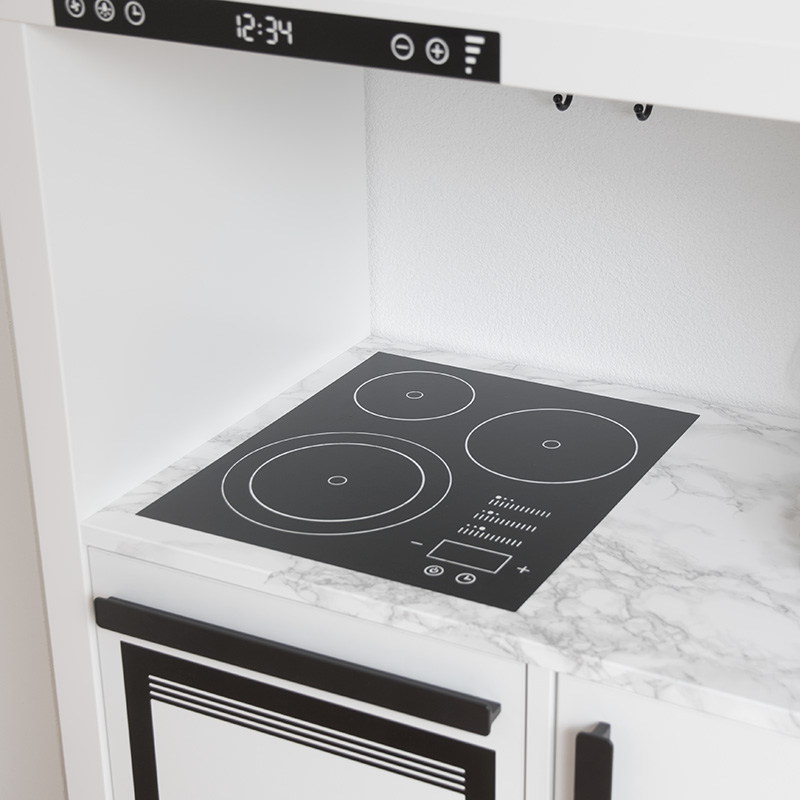 Spishäll och dekor för ugnslucka är anpassat i storlek för att passa hyllan Kallax från IKEA. Här har ugnen fått ett riktigt handtag.