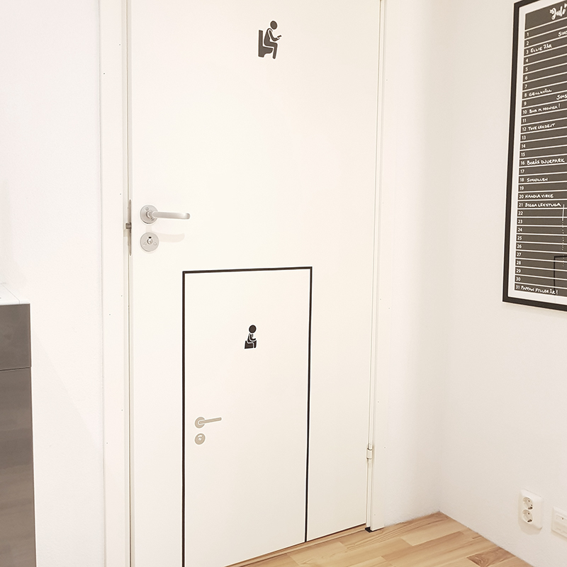 En dörr i dörren och skyltar till både barn och föräldrar.