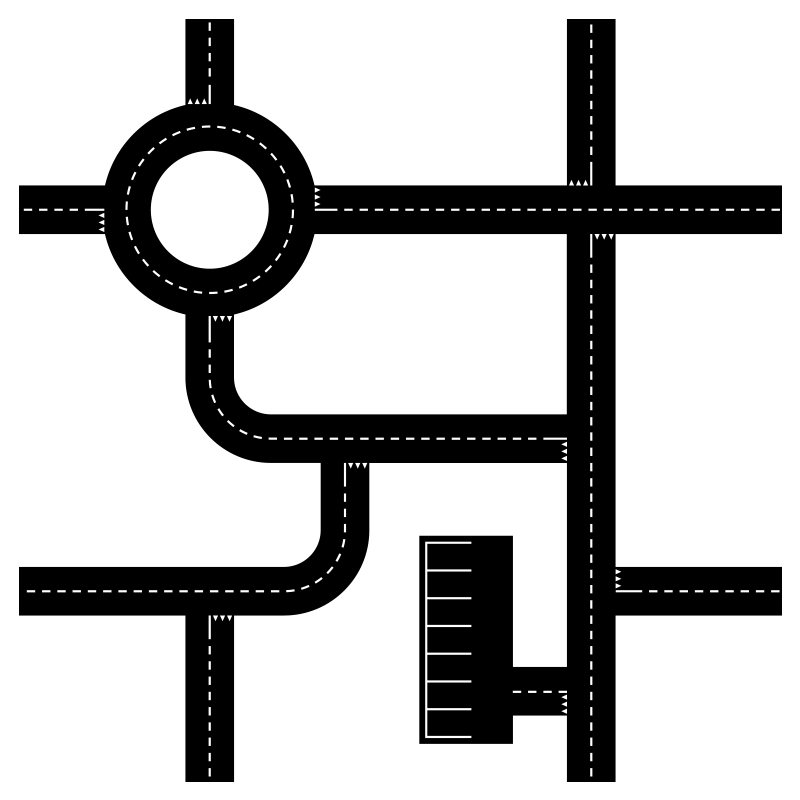Vägnät med svarta vägar, en rondell,, en parkering och diverse korsningar. Kan kombineras med flera sektioner som roteras i förhållande till varandra.