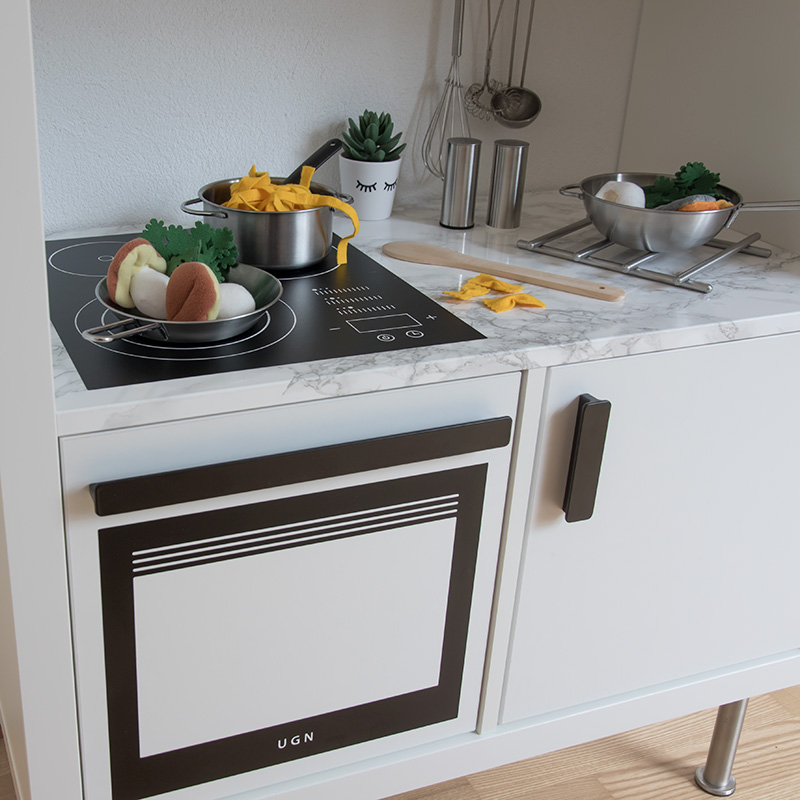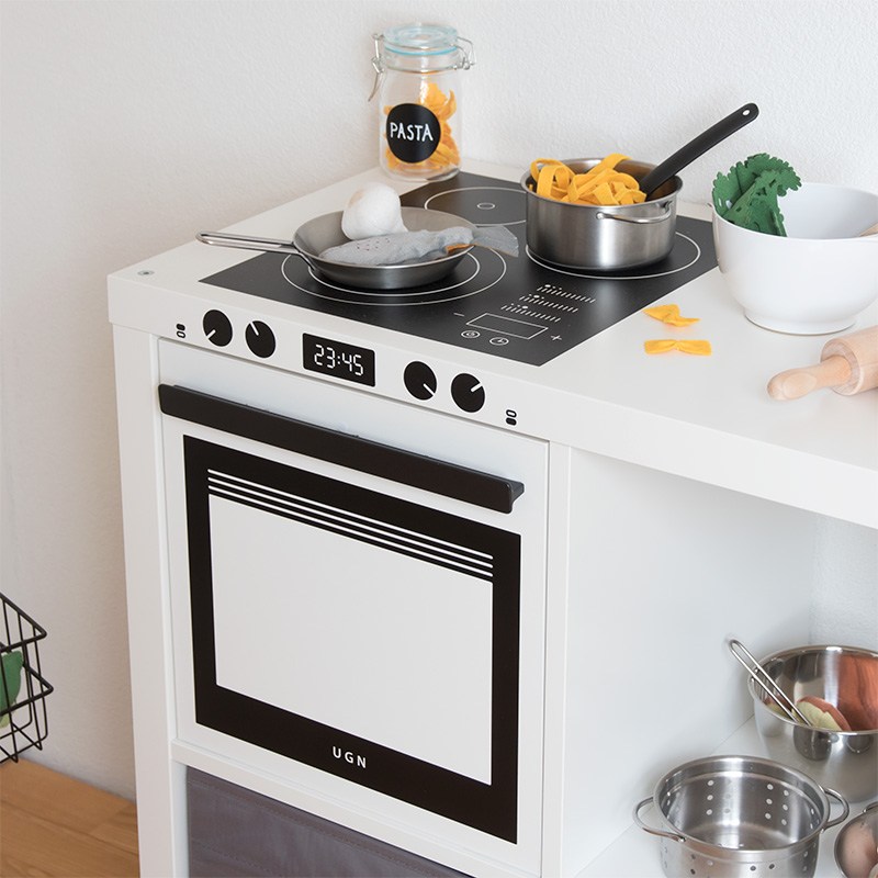 Reglage för spisfläkt, en spishäll med tre plattor och ugnslucka gör lekköket komplett!