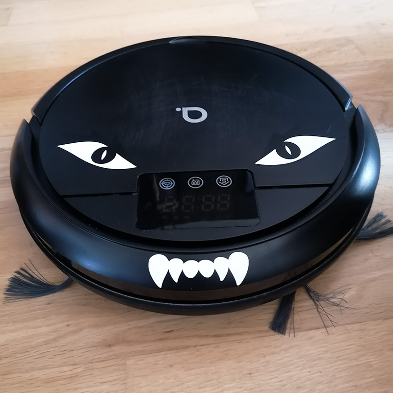 Robotdammsugare med ögon och huggtänder