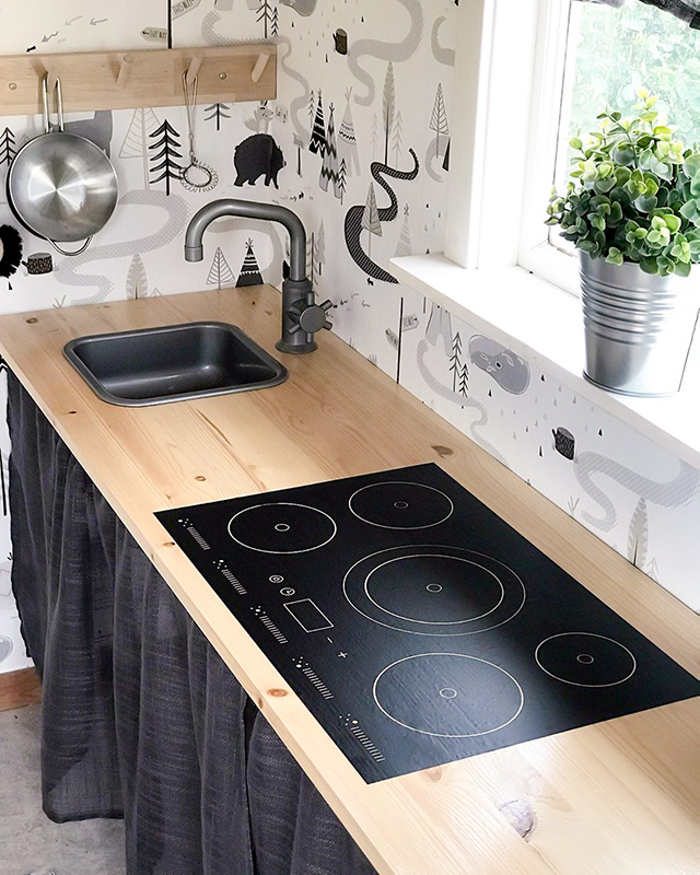 Läckert med stor spishäll och diskho från ett Duktig-kök hemma i lekstugan hos Sara med familj.