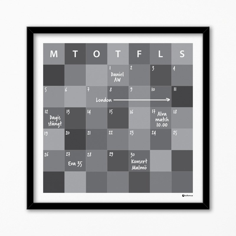 Den vita texten blir snygg med de grå fälten som bakgrund. Sudda, ändra och återanvänd månad efter månad.