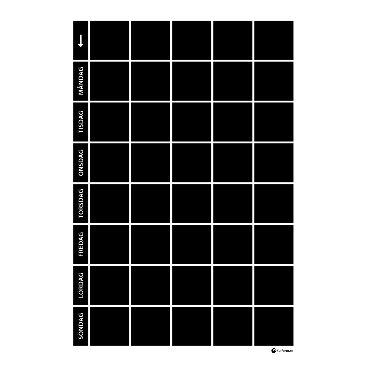 Planeringstavla för en vecka med fem kolumner. Mått (BxH): 50 x 70 cm.