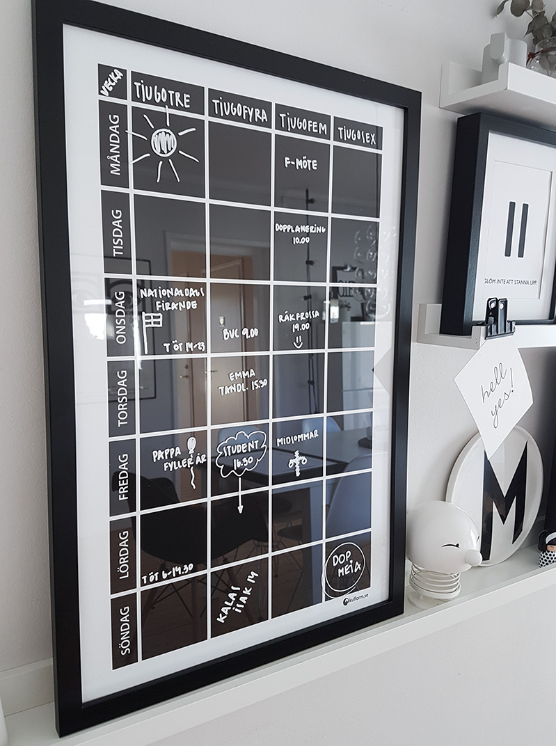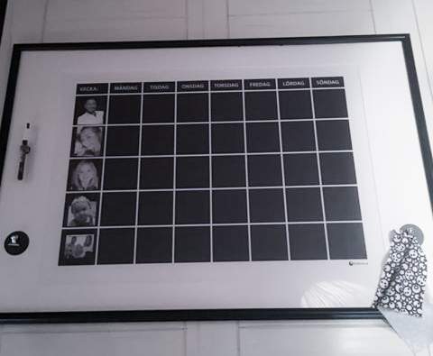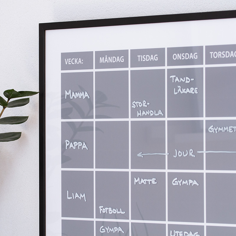 Med anteckningar om veckans aktiviteter i vitt mot en grå bakgrund så blir familjens liv en dekoration i rummet!