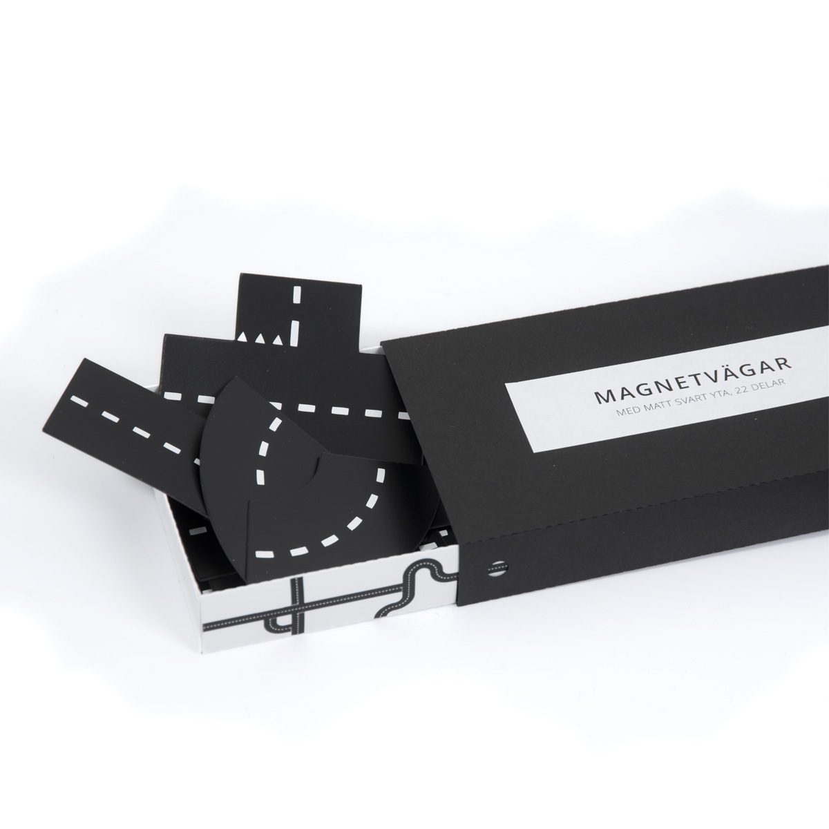 Magnetvägarna kommer förpackade i en snygg svart ask. Ett paket innehåller 22 vägdelar.