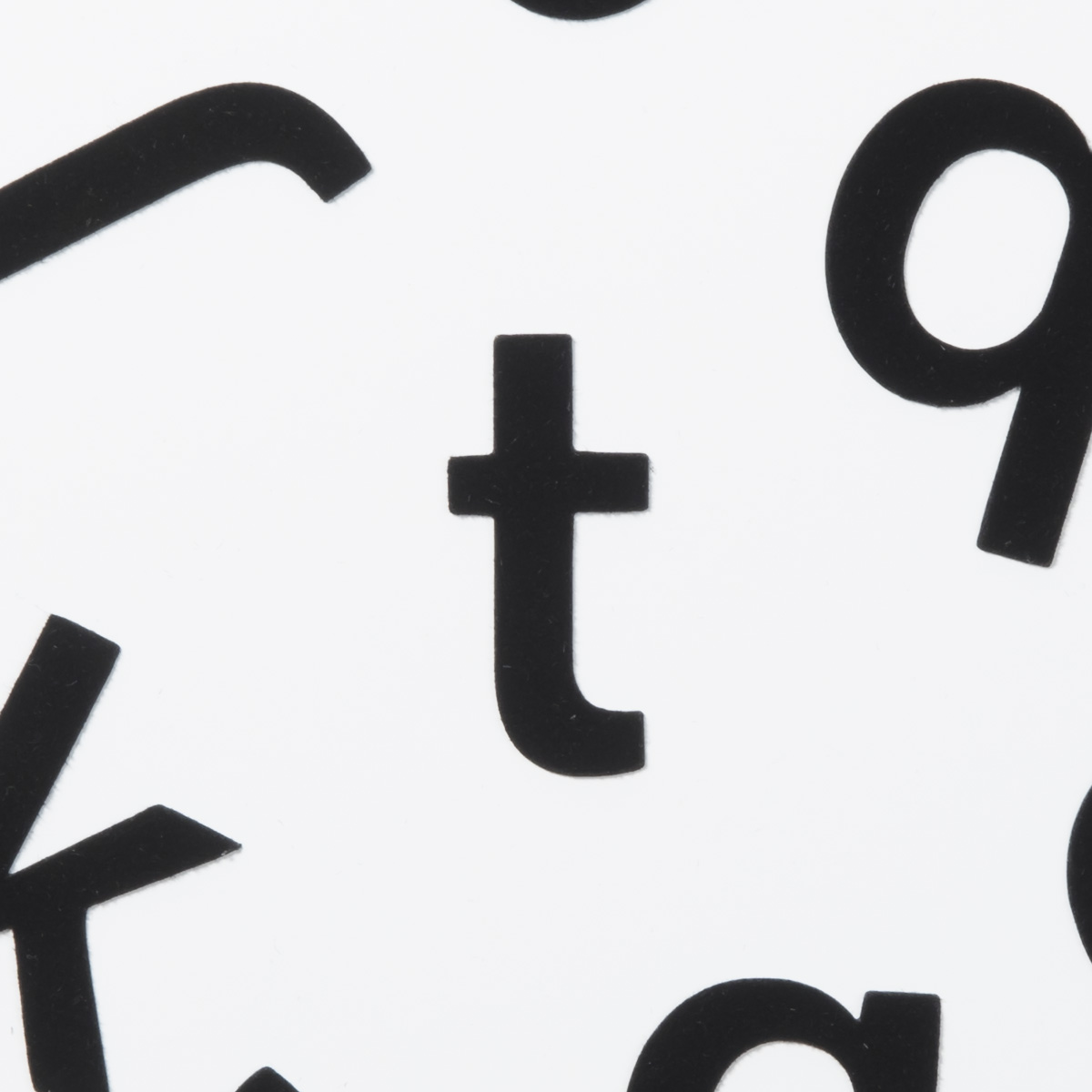 Lilla t – magnetbokstav med yta i svart sammet.