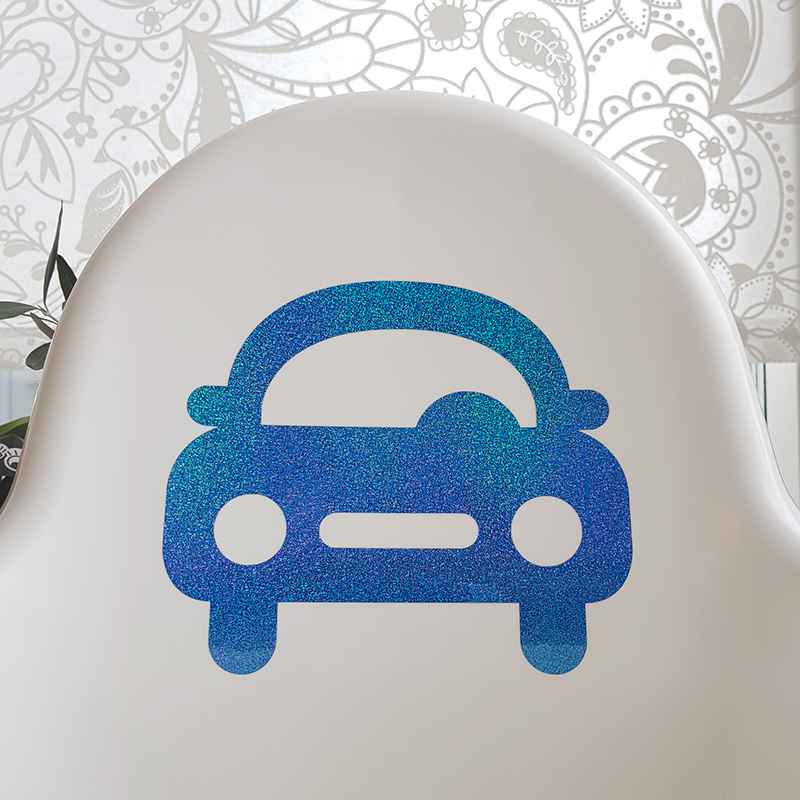 Fixa matstolen med en fin liten bil. Blå glitter som skimrar i regnbådens alla färger blir lätt en favorit.