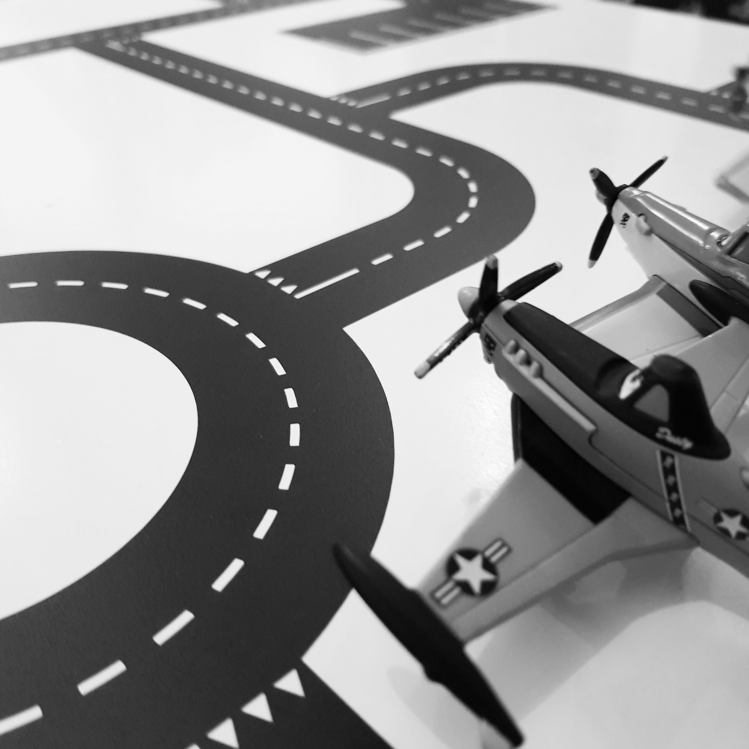 Vägnät med svarta vägar, en rondell,, en parkering och diverse korsningar. Kan kombineras med flera sektioner som roteras i förhållande till varandra.