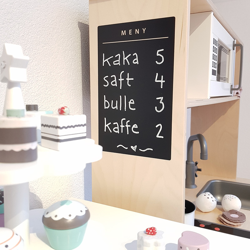 Menytavla på gaveln till det lilla köket Duktig från IKEA.