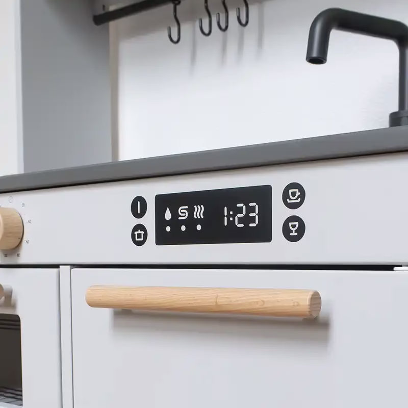 Diskmaskin i skåpet under diskhon på lilla Silltrut-köket från IKEA, fixar du med hjälp av dessa knappar och display. Dekoren innehåller en av- och på-knapp, display med symboler för var i programmet diskmaskinen är samt hur lång tid som återstår och tre små knappar med programval. Vill din lille/lilla kock ha ett alternativ till att handdiska så är det bara att slå till på dekalen för diskmaskin! Mer knappar – mer kul!
