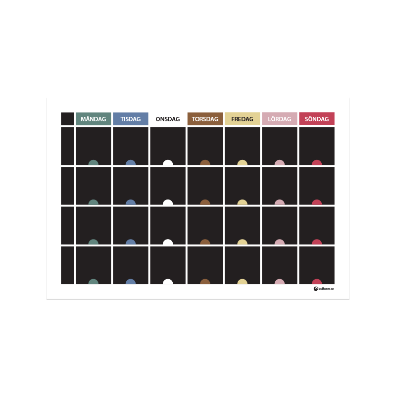 Planeringstavla med veckodagar i färg enligt TEACCH. Håll ordning på allt som händer under veckan och minska stress och onödiga missförstånd. Denna planeringstavla är indelad i fyra rader och går att få med eller utan de små halvcirklarna som påminner om veckodagsfärgen i de svarta fälten. Tavlan kan användas för en person/familj och de olika fälten utgör då delar av samma dag i en vecka eller skapar en översikt över fyra veckor. Alternativt kan planeringen vara uppdelad för olika familjemedlemmar som då får varsin rad med sina aktiviteter.
